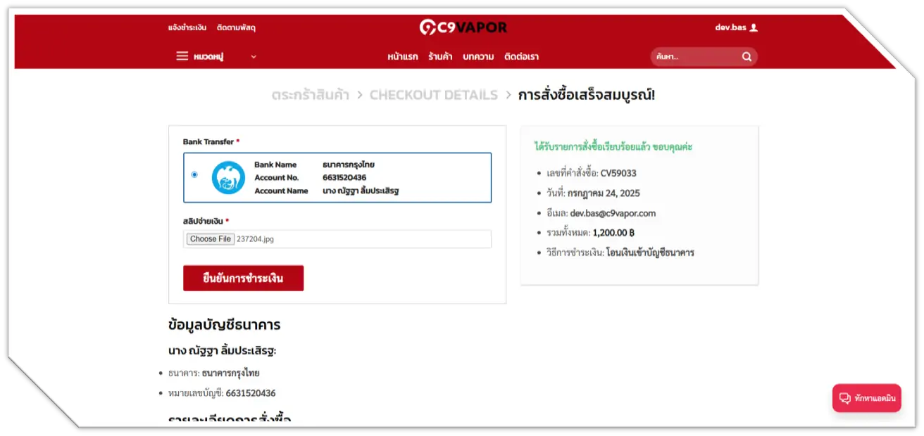 ขั้นตอนที่ 9 เมื่อทำรายการสำเร็จ ให้ทำการแนบสลิป โดยการคลิกที่ธนาคารปลายทาง และอัปโหลดสลิปโอนเงิน